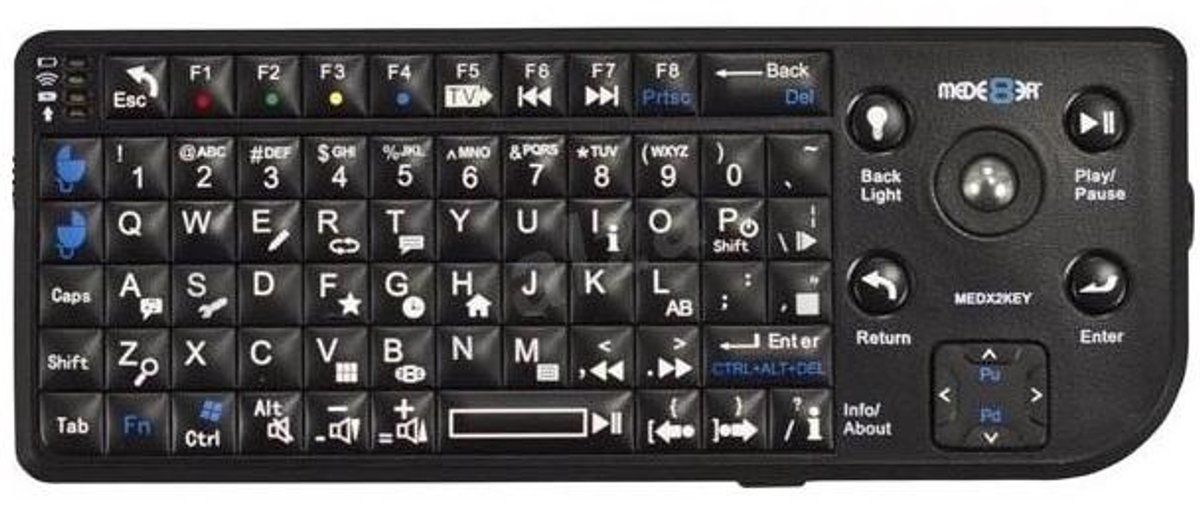 Dit MED2XKEY draadloos toetsenbord van Mede8er biedt je een betrouwbare verbinding met een bereik tot 10 meter. Het toetsenbord heeft op maat gemaakt functietoetsen. De Mede8er MED2XKEY is compatibel met alle Mede8er X2 Series Models.