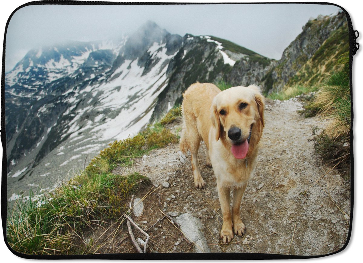 Laptophoes 14 inch - Een Golden Retriever op de bergpaden bovenop een berg - Laptop sleeve - Binnenmaat 33x23 cm - Zwarte achterkant
