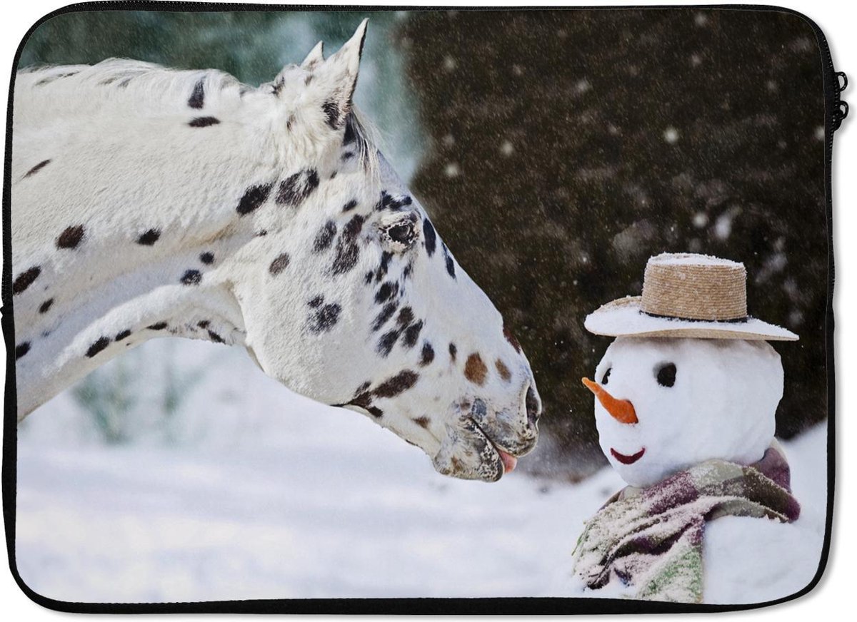 Laptophoes 14 inch - Paard - Sneeuwpop - Sneeuw - Laptop sleeve - Binnenmaat 33x23 cm - Zwarte achterkant
