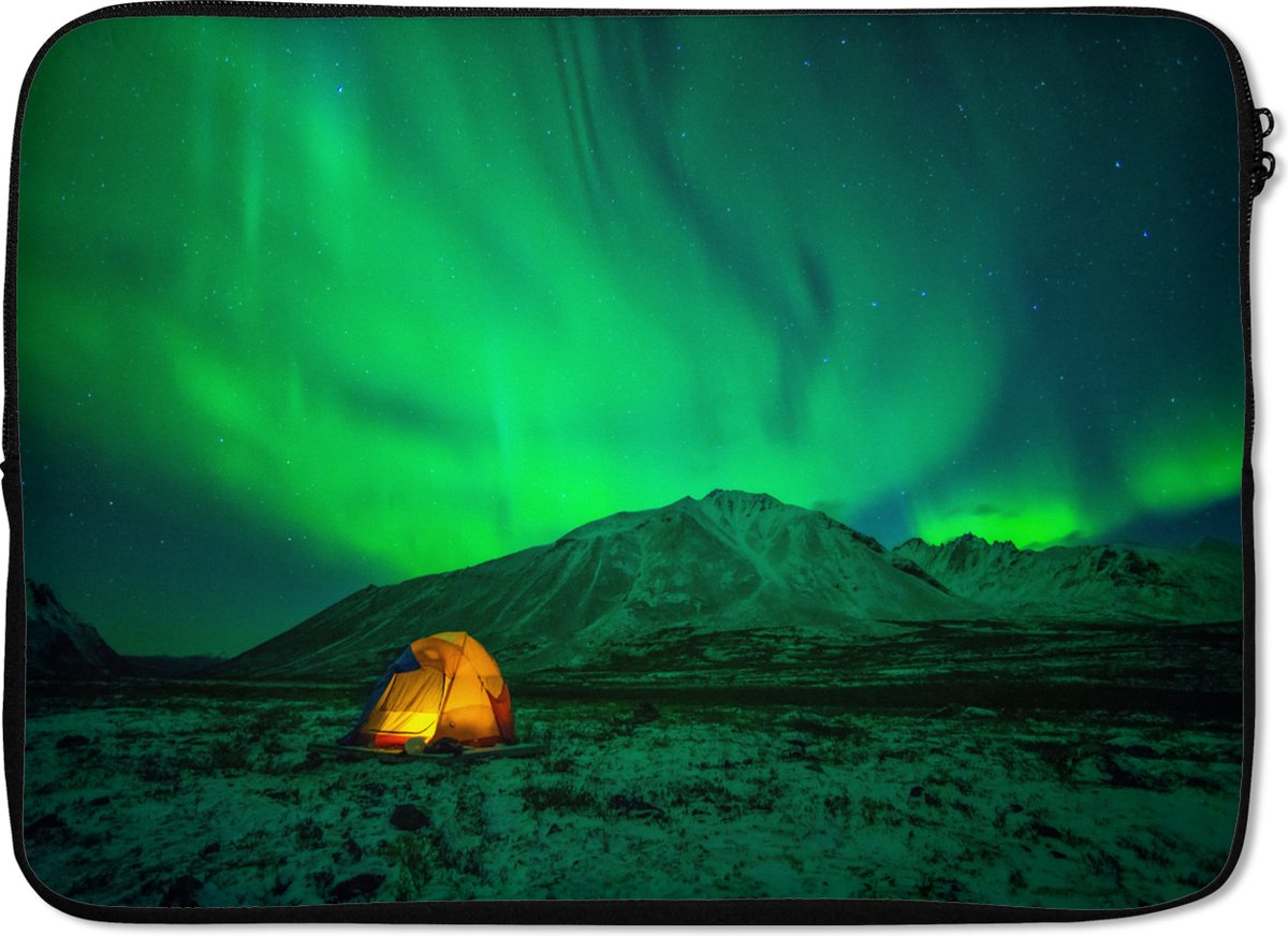 Laptophoes 14 inch - Noorderlicht - Tent - Berg - Laptop sleeve - Binnenmaat 33x23 cm - Zwarte achterkant