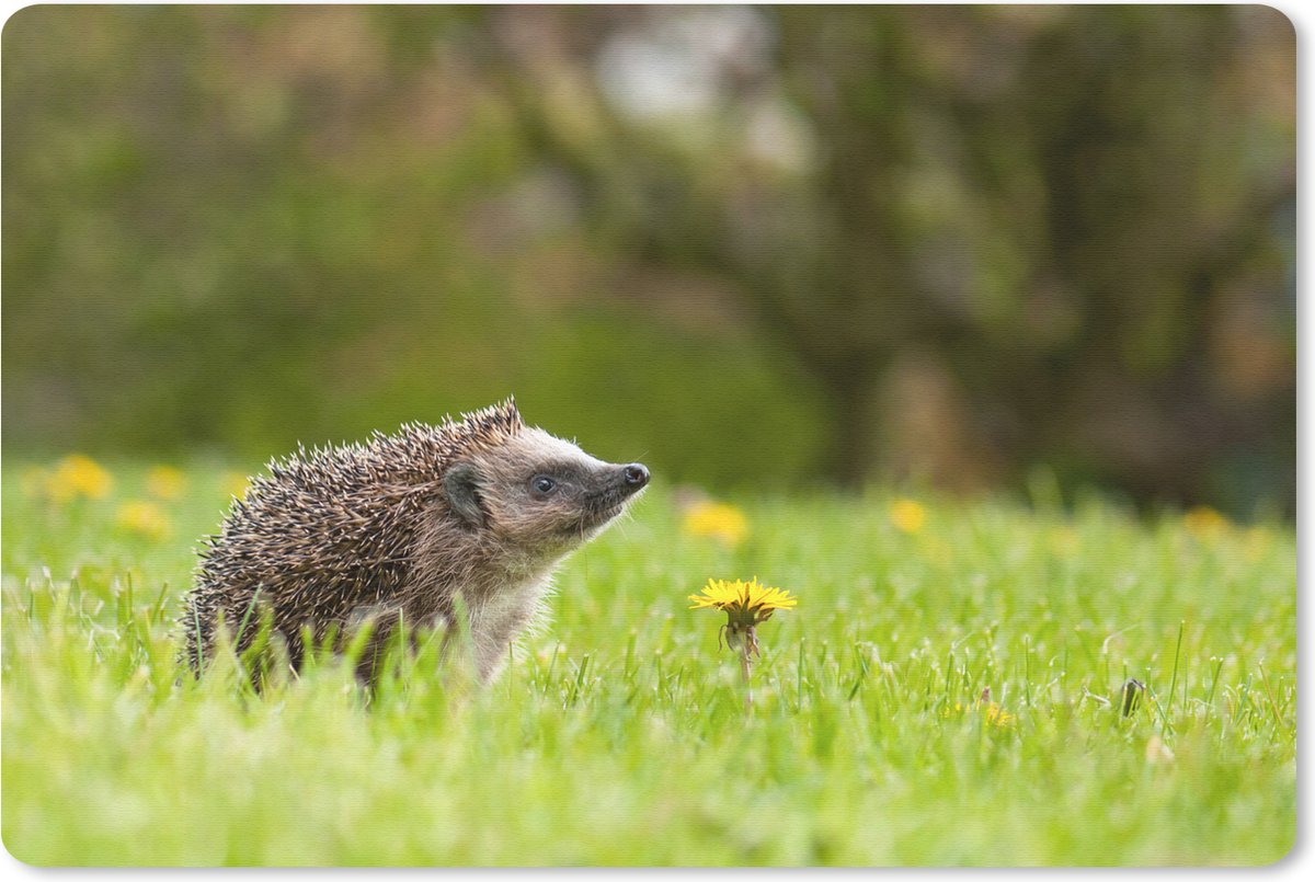 Muismat Dieren in de lente - Jonge egel bij een paardenbloem muismat rubber - 60x40 cm - Muismat met foto