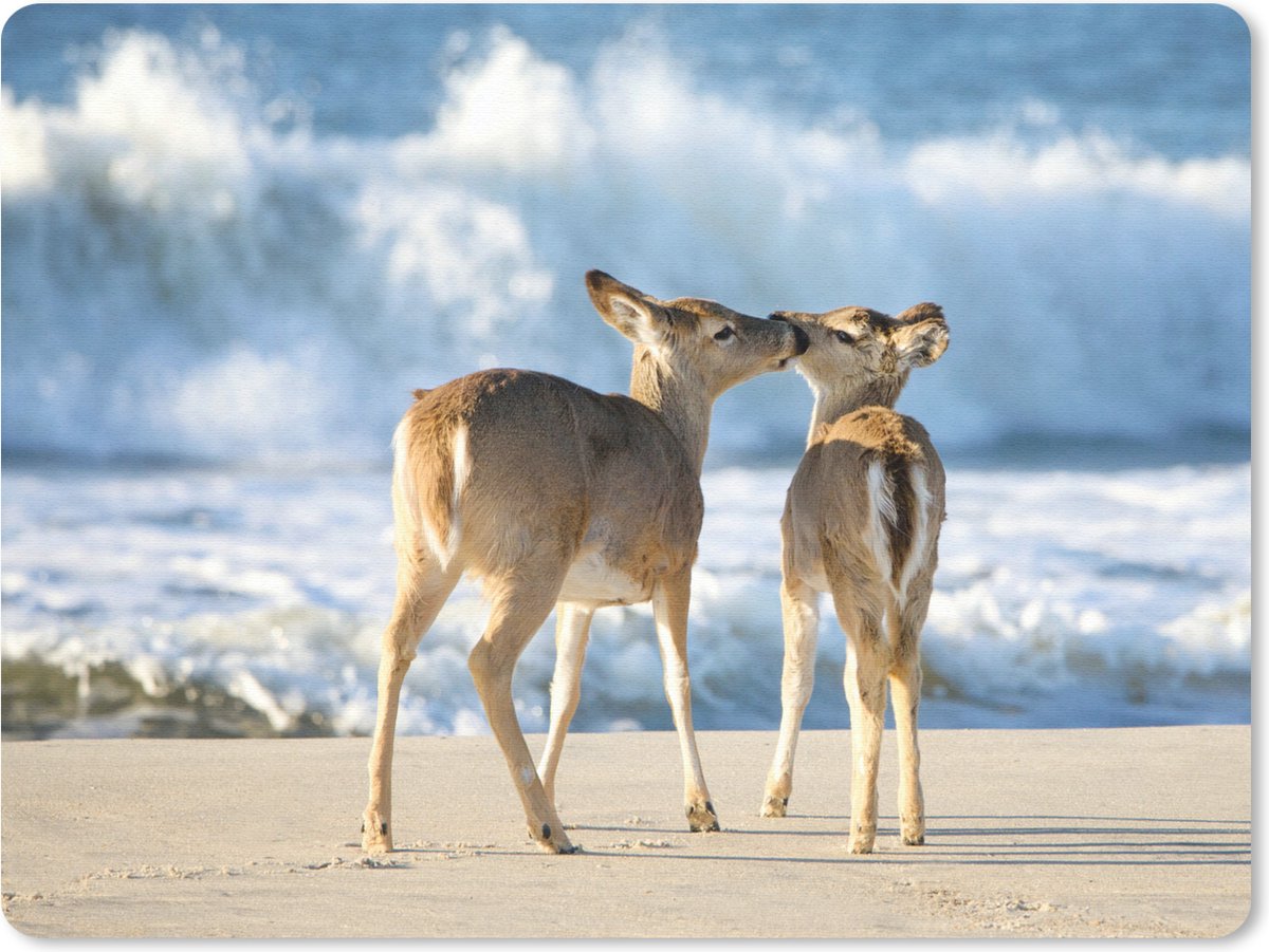 Twee liefdevolle herten met hun neuzen tegen elkaar. Achter het zijn de hoge golven te zien die afvloeien tegen het zand. Deze muismat is bijvoorbeeld ideaal voor het upgraden van je werkomgeving!