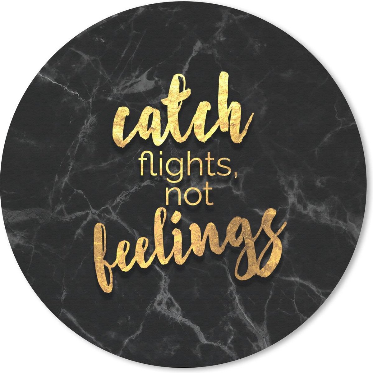 Poster met de quote: "Catch Flights Not Feelings" in gouden letters op een achtergrond van donker marmer..