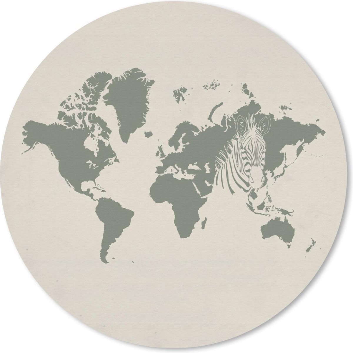 Een wereldkaart met een grijze kleur. In de kaart staat een zebra afgebeeld op een grijze achtergrond..