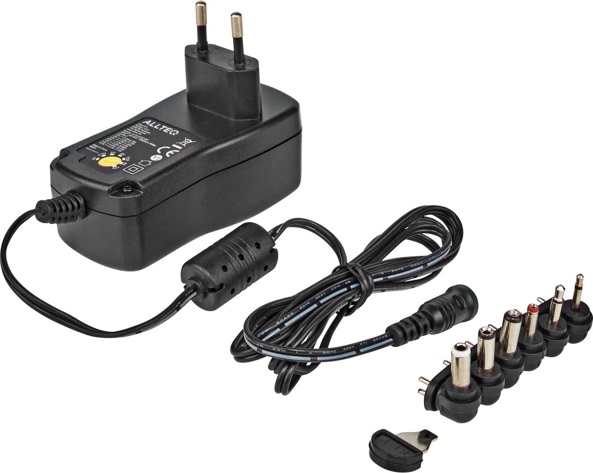 Een compacte en energiezuinige universele plug-in adapter inclusief 6 verwisselbare uitgangspluggen. Het is mogelijk om zelf de spanning te regelen zodat deze overeenkomt met het apparaat dat je wilt aansluiten en van voeding wilt voorzien. De uitgangsspanning die gekozen kan worden is 3/4.5/5/6/7.5/9/12 volt. De uitgaande stroomsterkte die geleverd wordt is 2250 milliampère.