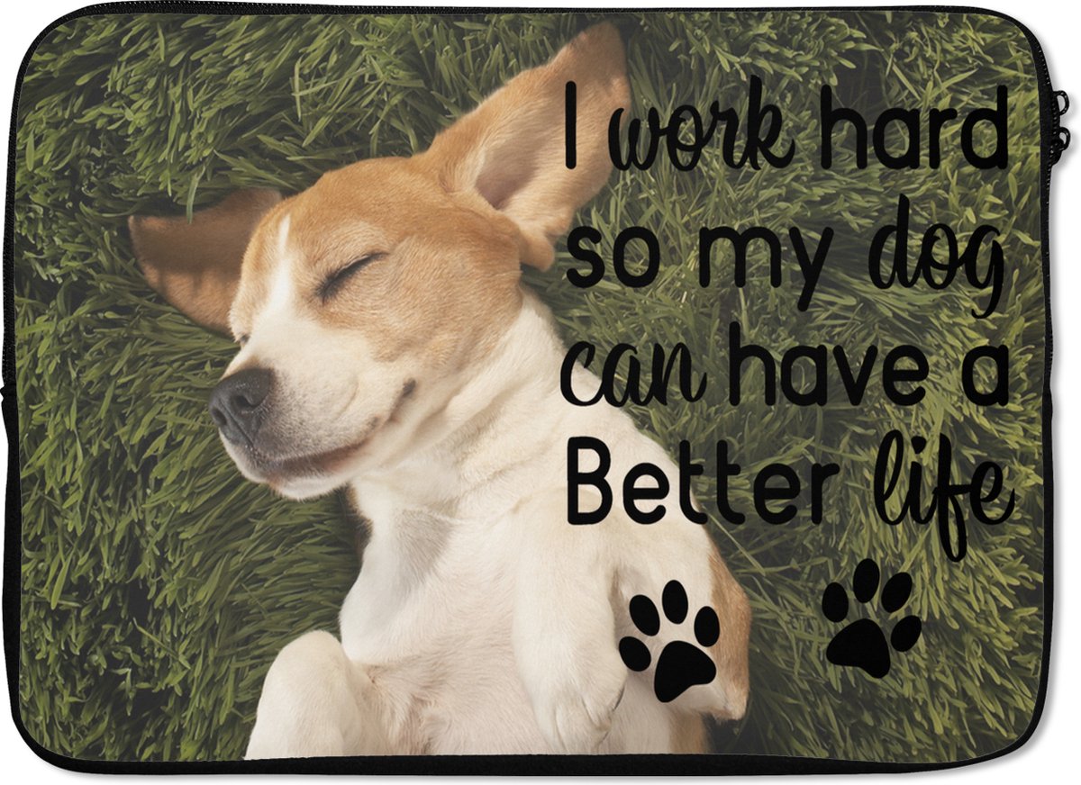 Laptophoes 14 inch - I work hard so my dog can have a better life - Spreuken - Quotes - Hond - Laptop sleeve - Binnenmaat 33x23 cm - Zwarte achterkant
