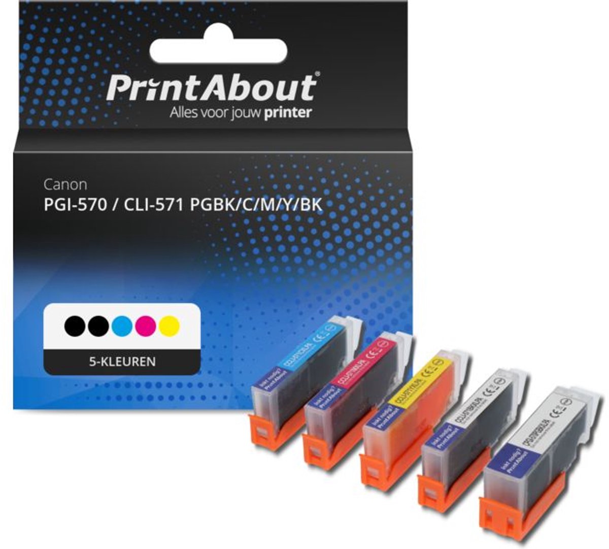 Met de Huismerk Canon PGI-570 / CLI-571 PGBK/C/M/Y/BK Inktcartridge 5-kleuren Voordeelbundel bespaar je direct op jouw printkosten. De Huismerk Canon PGI-570 / CLI-571 PGBK/C/M/Y/BK Inktcartridge 5-kleuren Voordeelbundel bevat meer inkt ten opzichte van het origineel. Hierdoor dalen jouw printkosten aanzienlijk. Je bespaart in totaal 70% per afdruk ten opzichte van de originele inktcartridges. Eigenlijk krijg je dus standaard korting als je kiest voor het PrintAbout huismerk.