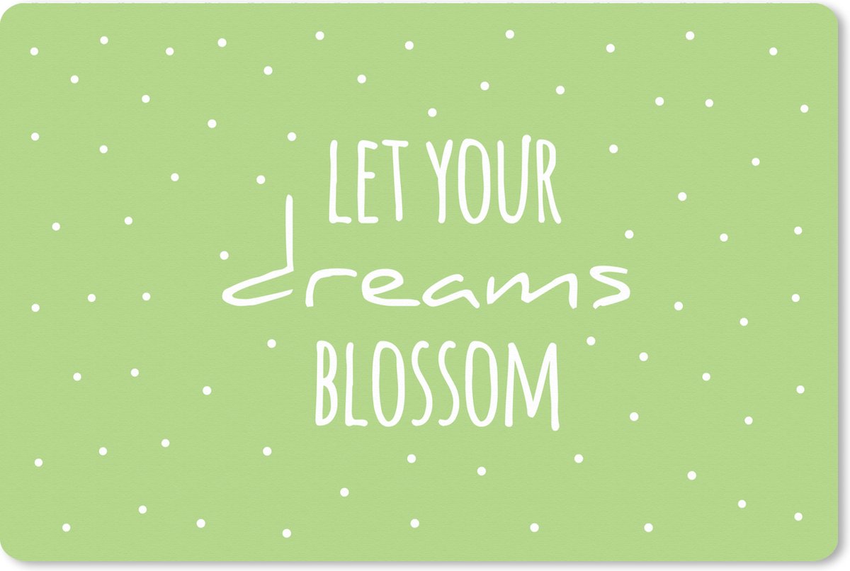 De quote 'Let your dreams blossom' op een groene achtergrond..