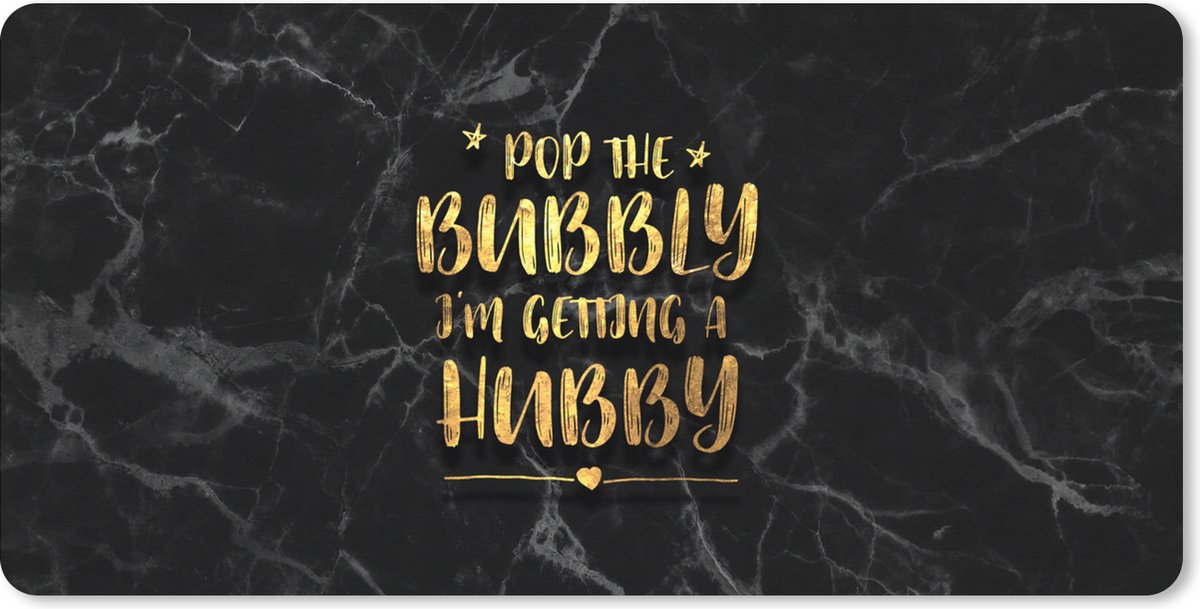 Goudkleurige quote: 'Pop the bubbly, I'm getting a hubby' op een zwart marmeren achtergrond..