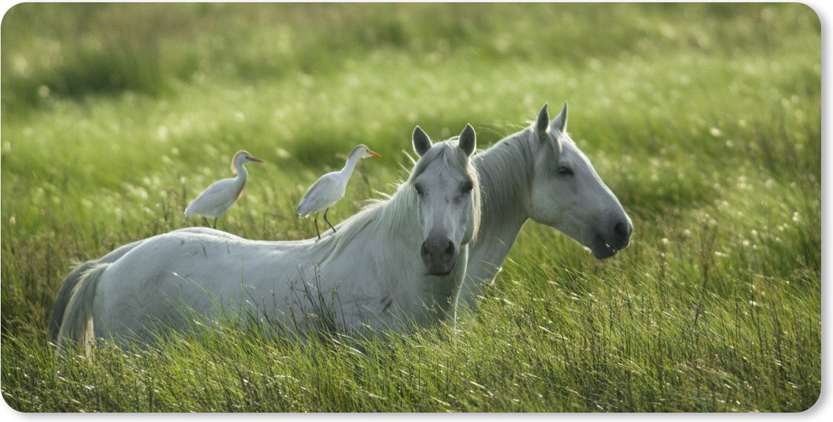 Twee paarden lopend door het hoge gras. Op de dieren staan twee vogels..