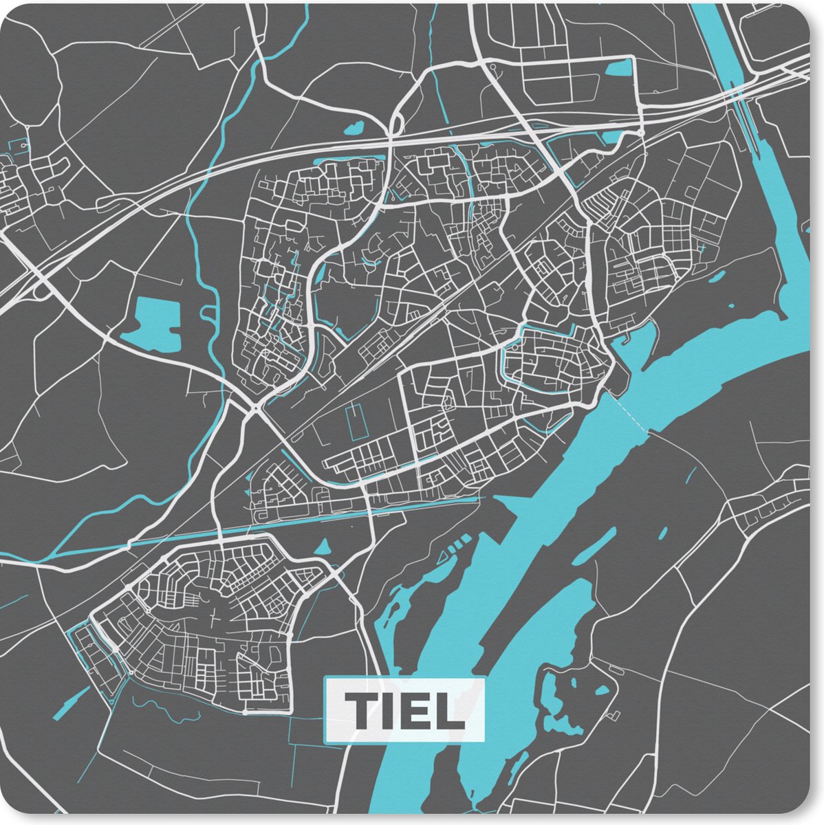 De plattegrond van de stad Tiel vanuit vogelperspectief in grijze en blauwe kleuren. De hele stad is te zien op deze kaart..