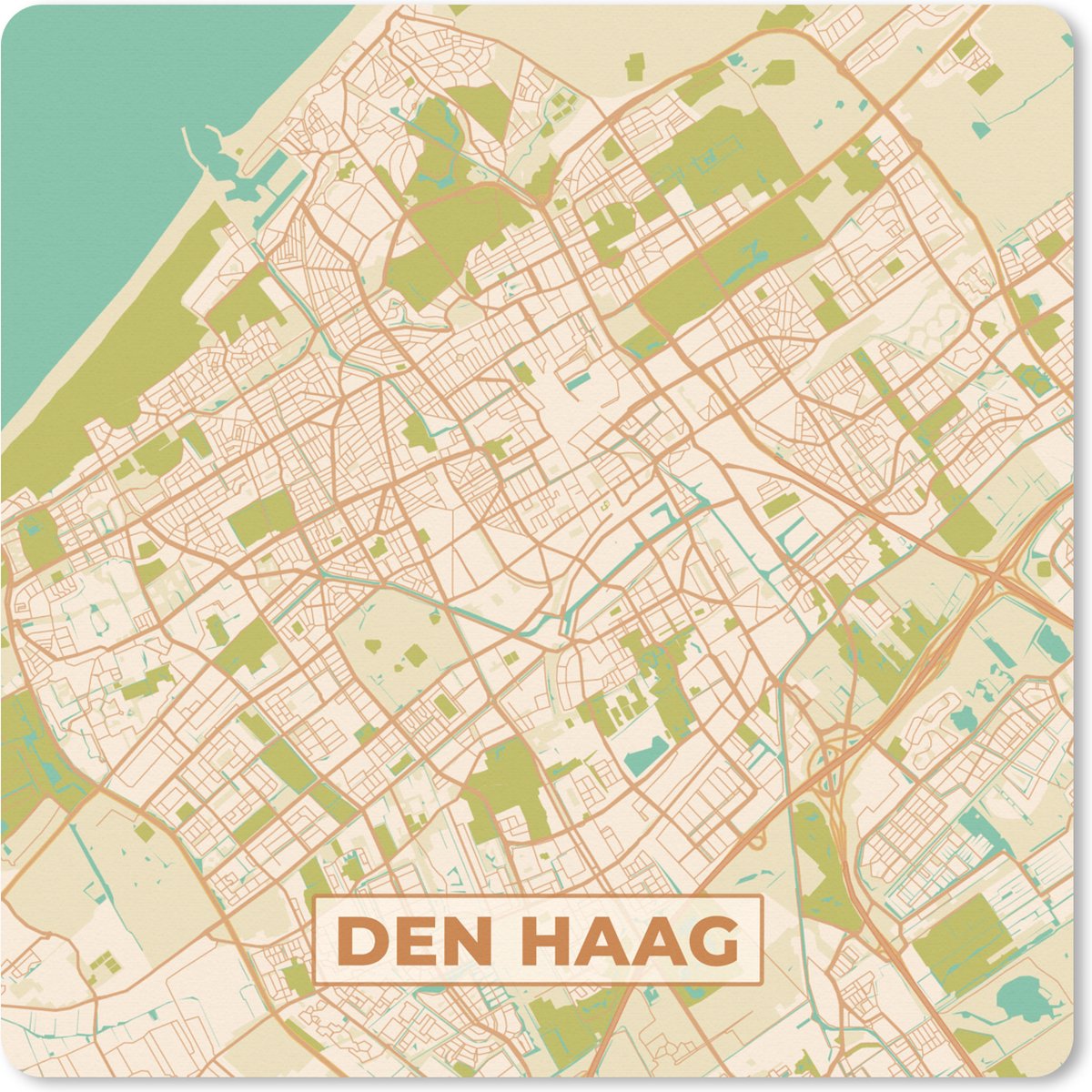 De stadskaart van Den Haag is op een vintage wijze en vanuit vogelperspectief weergegeven. De hele stad is zichtbaar op deze plattegrond..