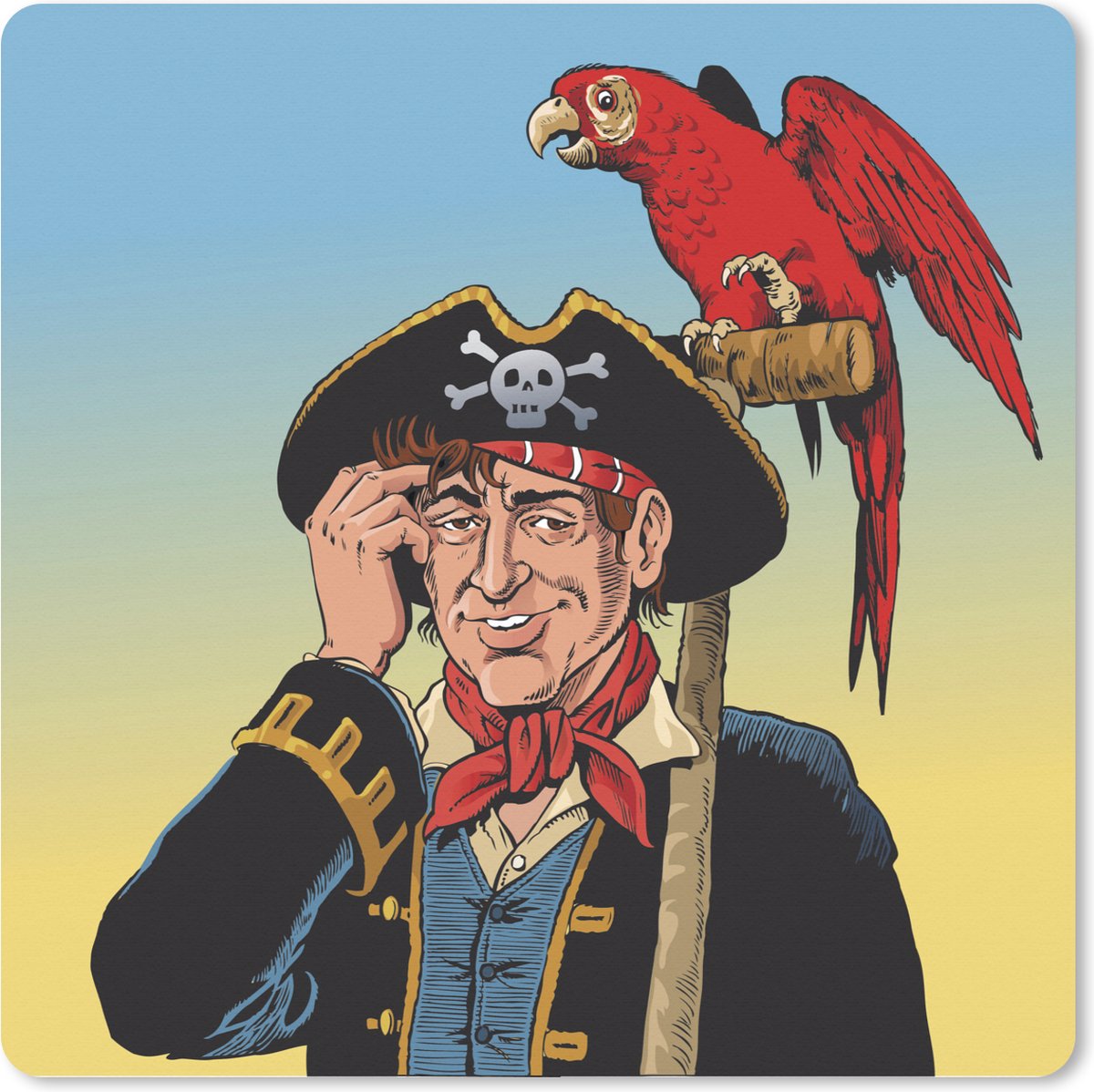 Een kinderillustratie van een piraat met zijn rode papegaai. Deze kleurrijke illustratie past perfect op elke kinderkamer..