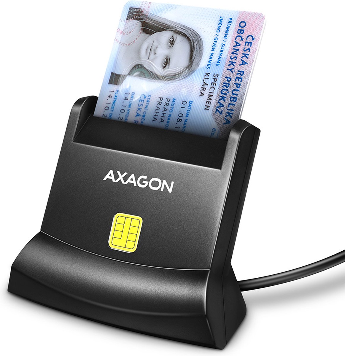 Desktop stand smart card / ID card reader AXAGON CRE-SM4N StandReader with USB 2.0 interface. The card reader supports all common contact smart card formats, chip cards and other cards, including contact bank payment cards or contact electronic ID cards *. The reader is compatible with most national applications for eID (electronic ID cards).