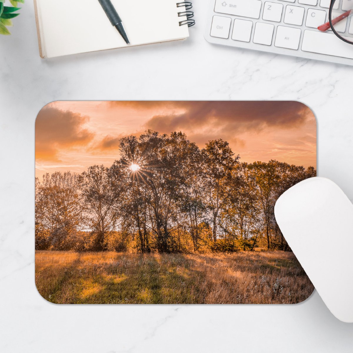 Muismat - Prachtige Zonsopkomst die schijnt door Herfstkleurige Bomen - 25x18 cm - 2 mm Dik - Muismat van Vinyl | RivalQuery | RivalQuery