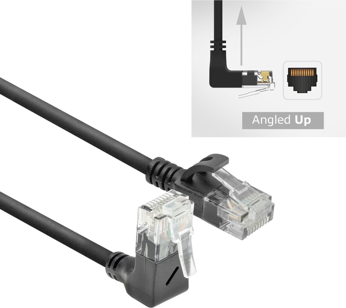 De patchkabel heeft een rechte RJ45 connector aan de ene kant en een 90° haaks naar boven RJ45 connector aan de andere kant. Ideaal voor situaties met beperkte ruimte zonder de maximale buigradius van de kabel te overschrijden. Bijvoorbeeld in netwerkkasten en achter apparatuur.