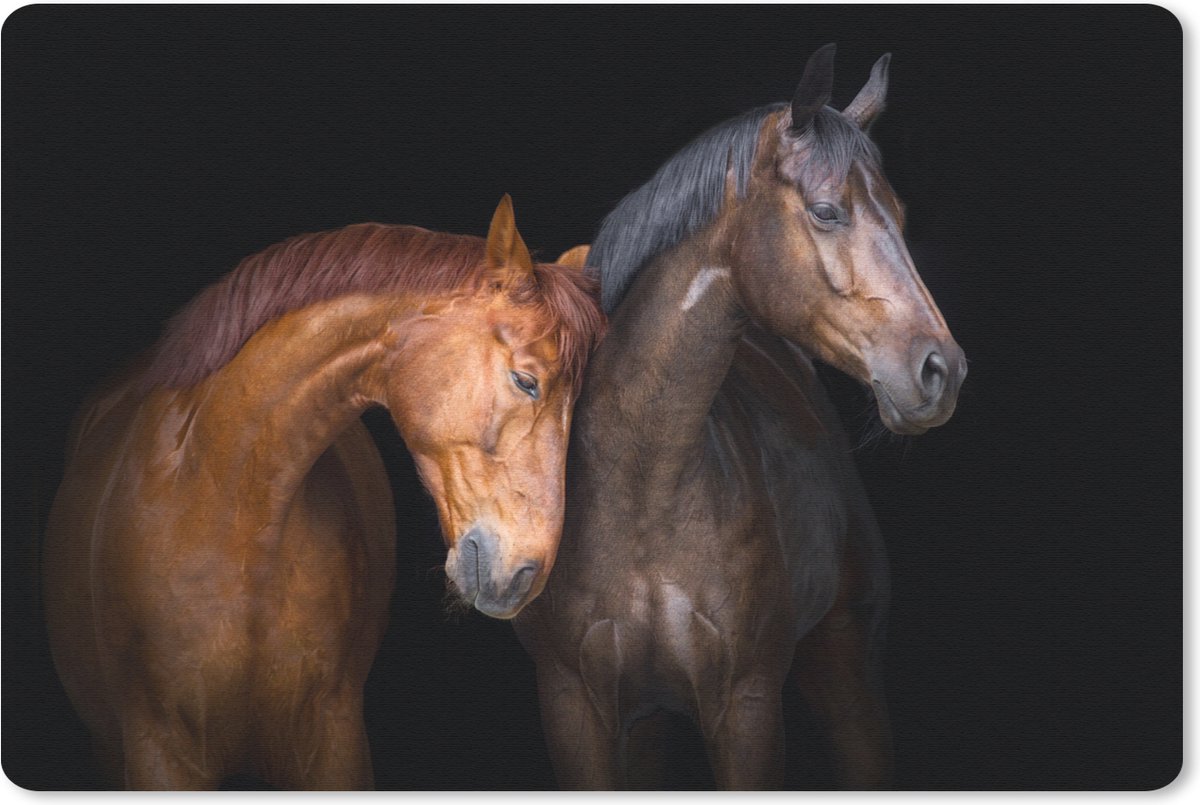 Portret van twee bruine paarden tegen een zwarte achtergrond..