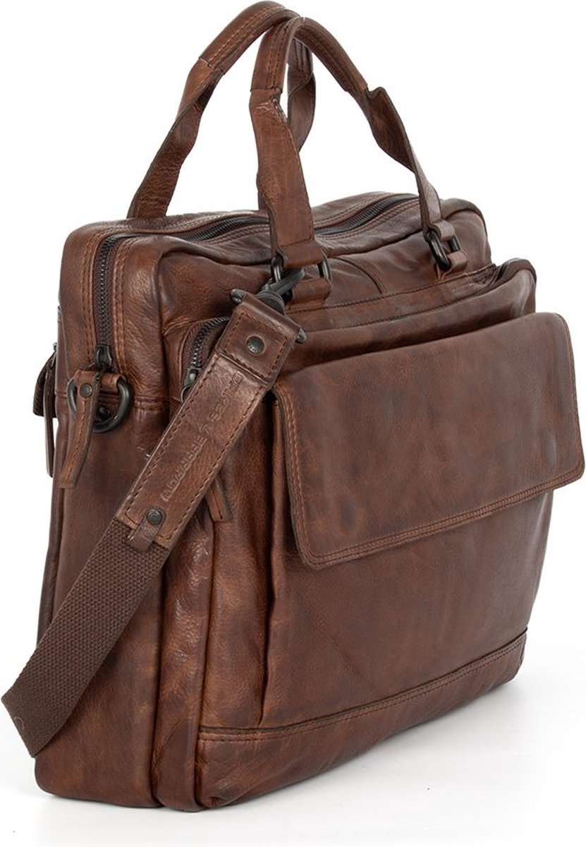 Kleur: donkerbruin Afmeting: 37,5 x 10,5 x 29 cm Materiaal: Apache leer Exterieur: voorvak met rits, voorvak met klep en magneetsluiting, hoofdvak met rits, achtervak met rits en verborgen trolleyband Interieur: foamed laptopvak, verstelbaar vak, ritsvak, sleutelhanger, kabel-/flessenvak Grootte laptop/tablet: 36,5 x 27,5 cm / 15 inch Hengsels en banden: 2 handgrepen, afneembare lange schouderband Garantie: 2 jaar