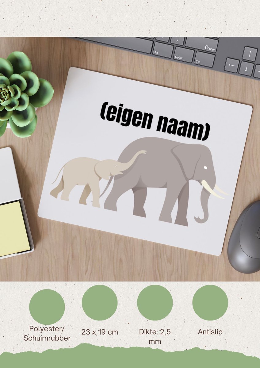 Deze olifant en kleine met eigen naam muismat is speciaal ontworpen voor dieren liefhebber en heeft het thema olifant. De muismat heeft een formaat van 23 bij 19 CM en gemaakt van polyester schuimrubber. Laat je inspireren door de verschillende soorten stijlen op de muismatten!