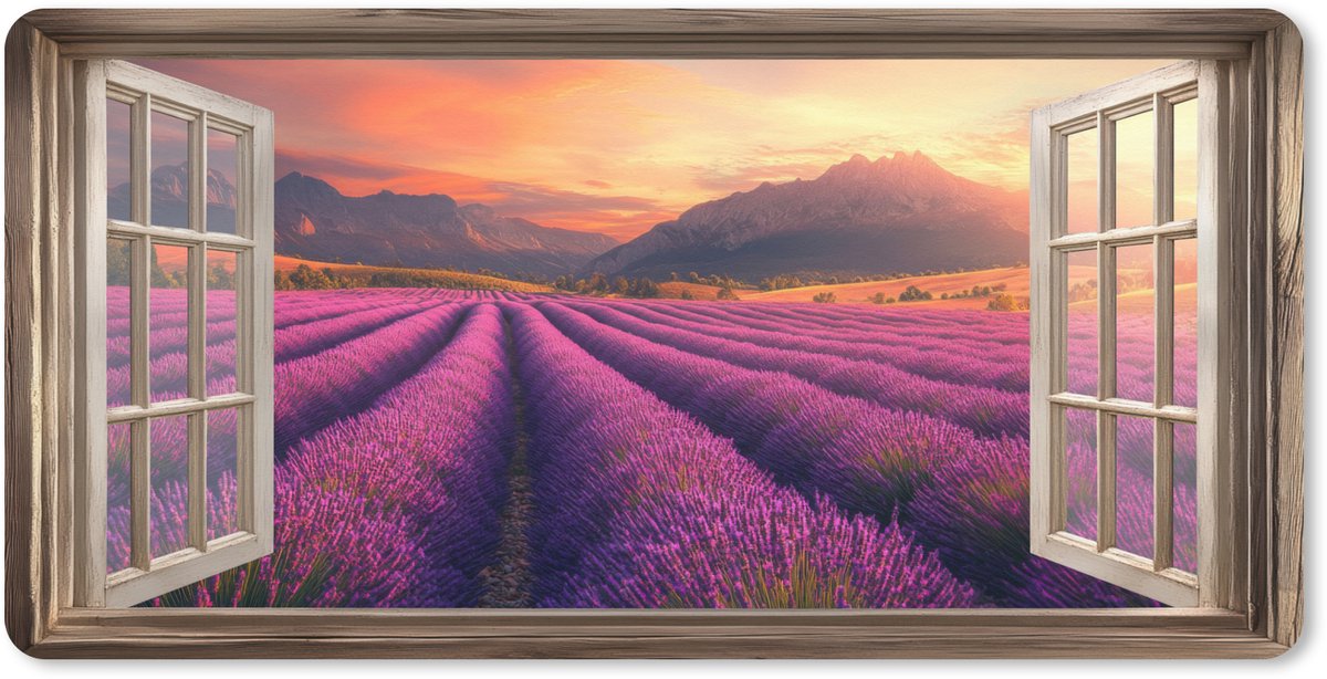 Een uitzicht op uitgestrekte lavendelvelden bij zonsondergang, gezien door een open raam. De paarse rijen lavendel strekken zich eindeloos uit en contrasteren prachtig met de warme oranje en roze tinten van de lucht..