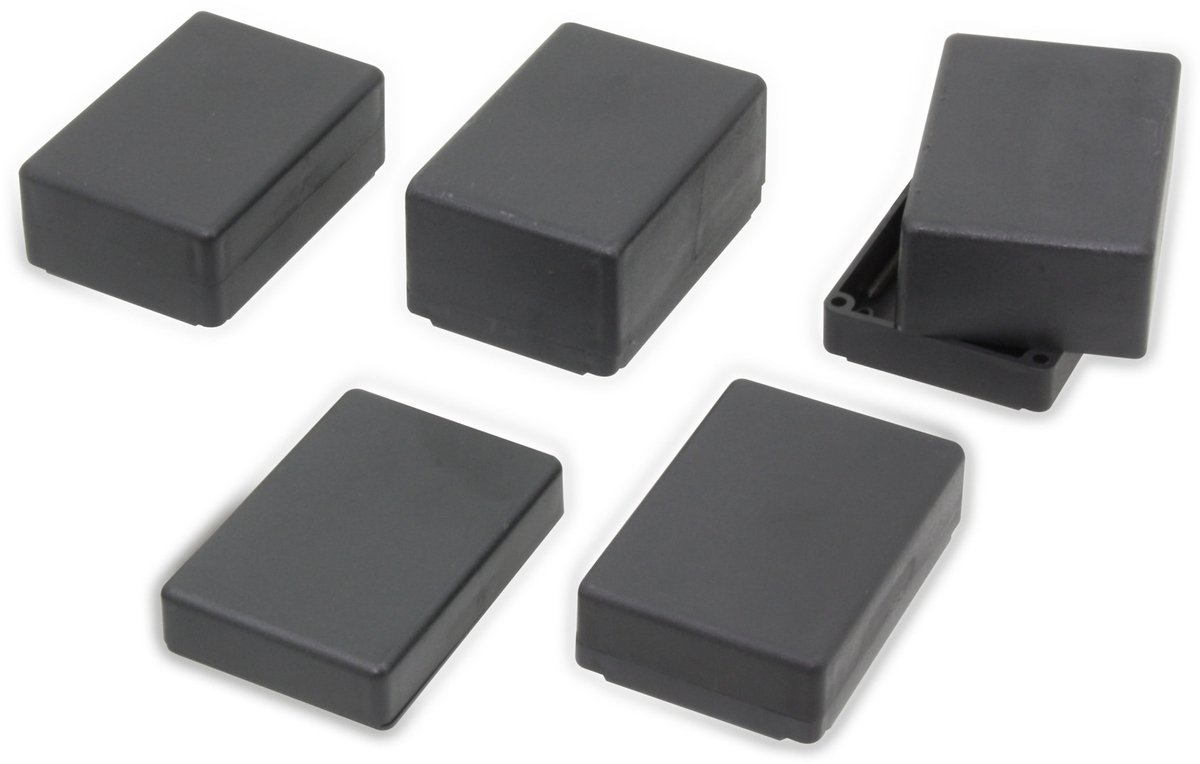 Afmetingen (LxBxH): 72x50x41 mm. Elegante ABS behuizing met ronde randen, zwart, geschikt voor de montage van kleine printplaten. Wordt volledig gemonteerd geleverd met 4 zelftappende schroeven.