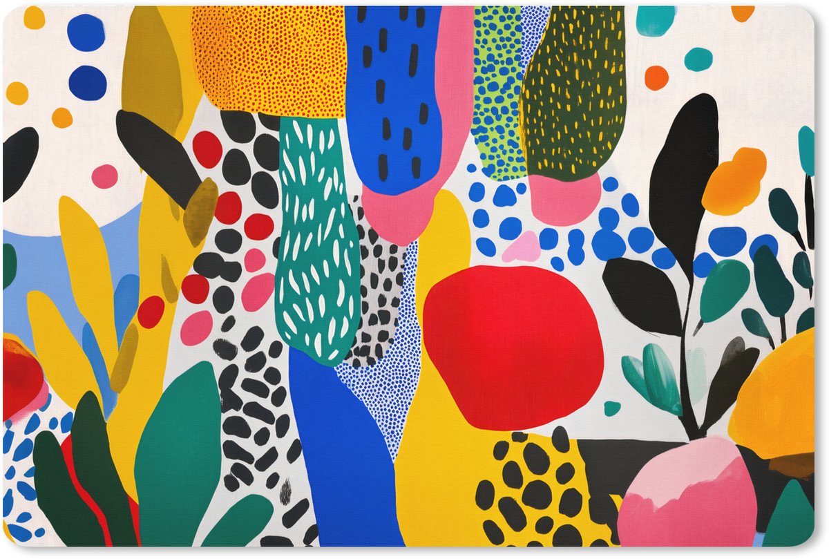 Een collage van afgeronde vormen en stippen in kleuren als rood, geel, blauw, groen en roze. De compositie is speels en modern, met een mix van stippen en bladmotieven..