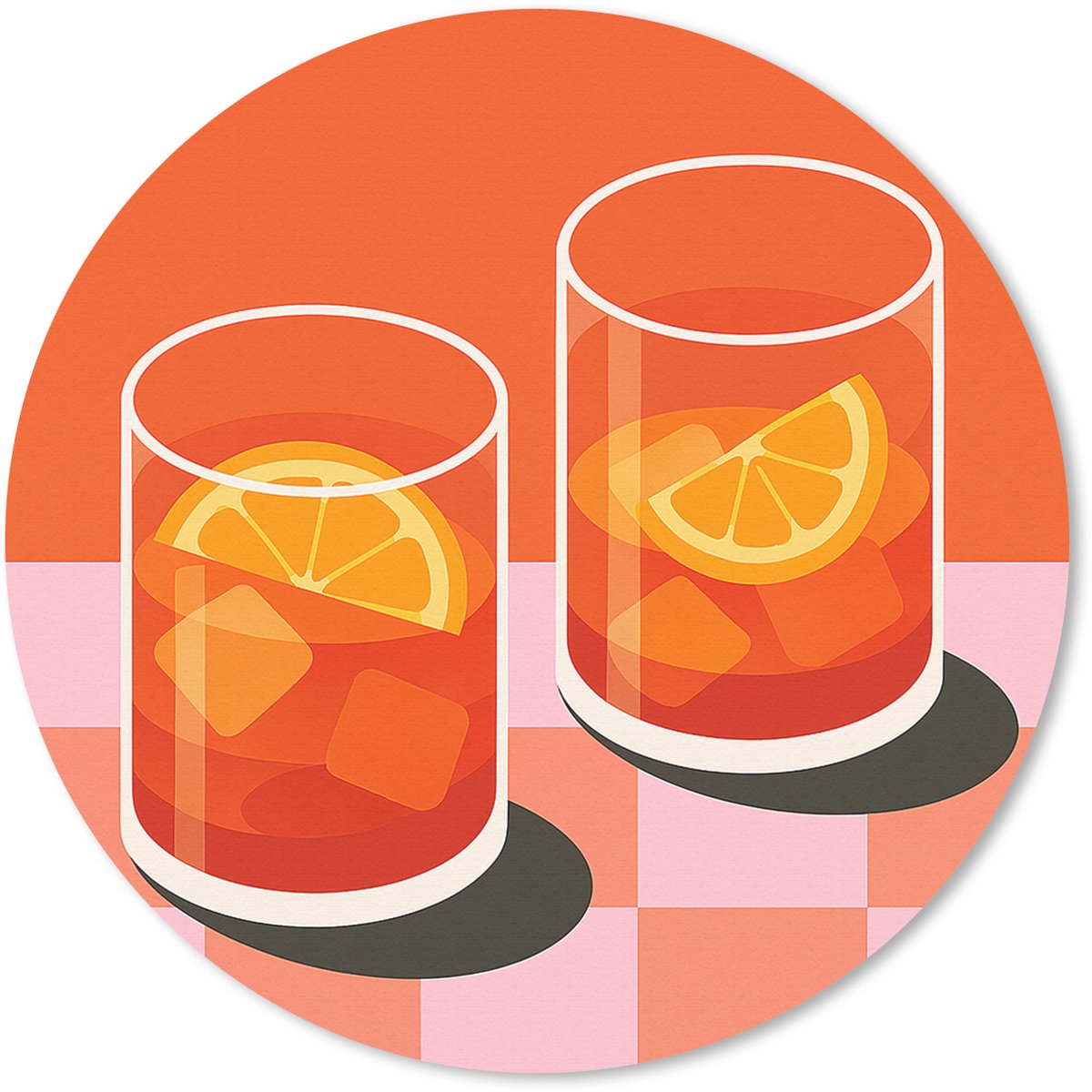 Twee glazen met oranje drank, ijsblokjes en sinaasappelpartjes staan op een roze-rood geruite ondergrond met felrode wand..