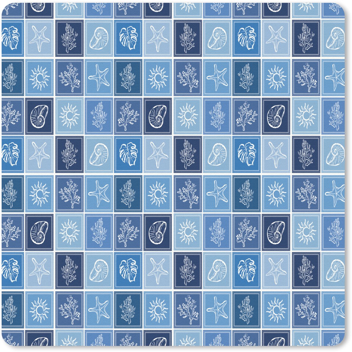 Herhalend patroon van vierkante tegels in verschillende blauwtinten met witte illustraties van zeedieren, koralen, zonnen, bladeren en schelpen. Elke tegel heeft een decoratieve rand en straalt een rustieke, maritieme sfeer uit, geïnspireerd op een nostalgische kuststijl..
