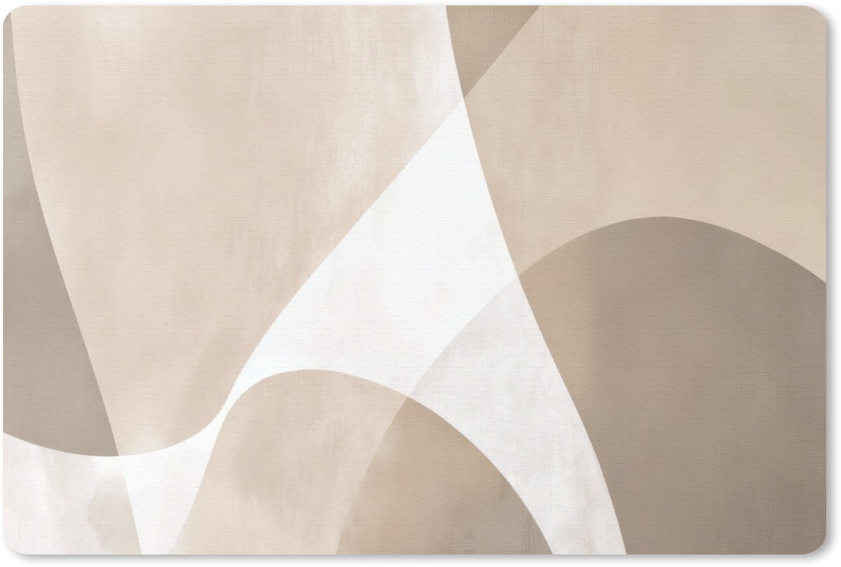 Vloeiende; abstracte lijnen en vlakken in beige en wit overlappen elkaar. De zachte rondingen geven de afbeelding een rustige, harmonieuze sfeer..