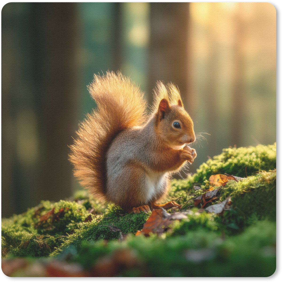 Een rode eekhoorn zit op een bed van mos met een noot in zijn pootjes. De zon verlicht zijn pluimstaart terwijl herfstbladeren verspreid liggen...