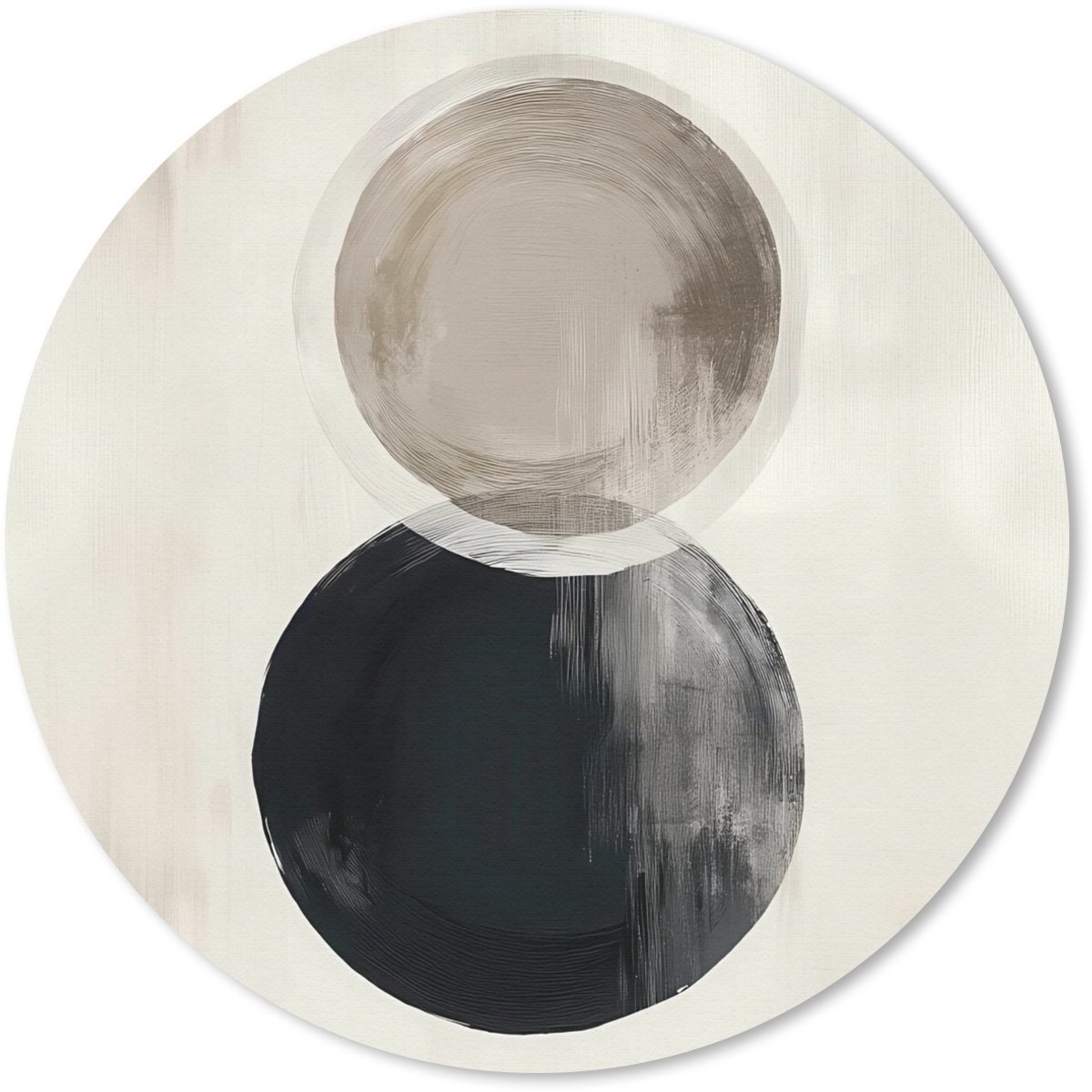Twee cirkels, een lichtbruine en een zwarte, raken elkaar verticaal op een beige achtergrond. De penseelstreken zijn zacht en vaag, met een lichte overlap tussen de vormen...