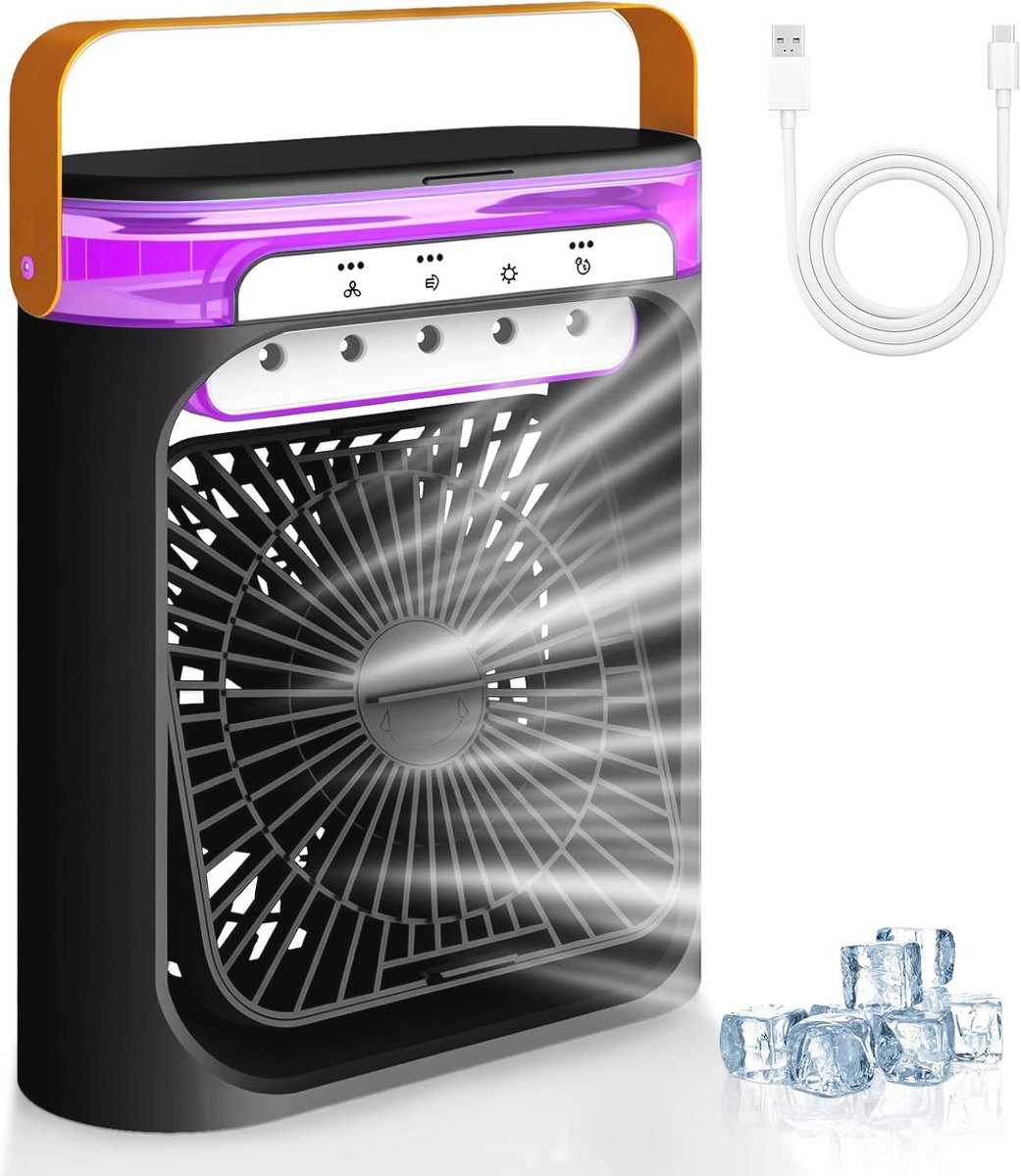 Verfris je omgeving met deze draagbare 4-in-1 mini airconditioner, ideaal voor thuis, kantoor of buiten. Deze persoonlijke luchtkoeler biedt een verdampingsluchtbevochtiger met 7 kleuren LED-verlichting en is eenvoudig te bedienen met drie snelheden. Houd er rekening mee dat je altijd zuiver water aan de luchtkoeler moet toevoegen om onzuiverheden te voorkomen die de koelfunctie kunnen beïnvloeden. Vul de watertank tot ongeveer driekwart en maak deze wekelijks schoon om kalk af te voeren. Geniet van een verfrissende bries door ijsblokjes aan het waterreservoir toe te voegen. Het gebruik is eenvoudig: druk op de ventilatorknop om tussen de snelheden te schakelen of gebruik de sproeiknop voor een verneveling. De timerfunctie is instelbaar op 2, 4 of 6 uur. In de verpakking vind je de draagbare airconditioner, een 0,8 m USB Type-C kabel en een handleiding.