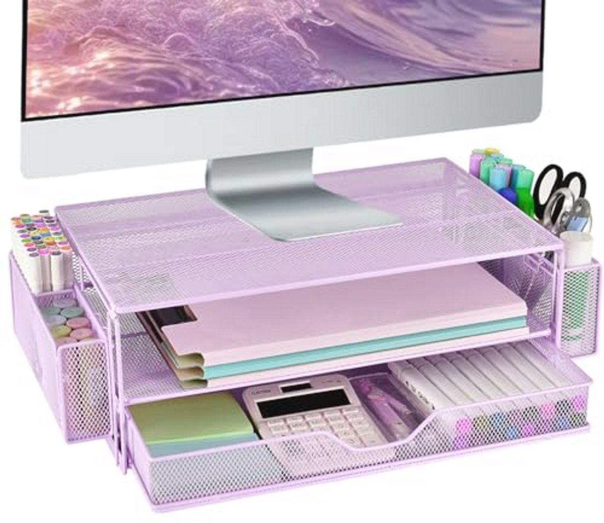 Verbeter uw werkruimte met deze stijlvolle en multifunctionele computermonitorstandaard. Met een ergonomisch ontwerp zorgt de monitorstandaard voor optimale kijkhoeken, waardoor nek- en oogbelasting tijdens lange werkdagen vermindert. De standaard biedt een geïntegreerd opbergvak voor pennen, papier en andere kantoorbenodigdheden, waardoor u een nette en georganiseerde omgeving kunt creëren. Zeg vaarwel tegen rommel en maak uw bureau efficiënter met deze handige bureauaccessoire.