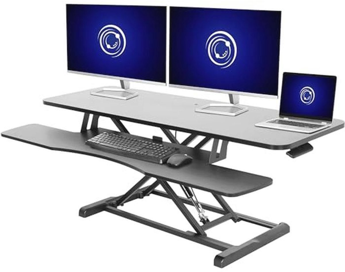 Verbeter je werkervaring met deze 121,9 cm hoogteverstelbare bureauconverter in zwart. De overgang tussen zitten en staan tijdens lange werkuren biedt talrijke voordelen, zoals een verbeterde doorbloeding en verminderde spanning. Met een robuuste desktop die tot 15 kg ondersteunt, is deze converter ideaal voor het plaatsen van meerdere monitoren of een combinatie van laptop en monitor. De pneumatische veerhefboom zorgt voor een eenvoudige en soepele hoogteverstelling met slechts een druk op de handgreep. Het slimme tweetraps ontwerp laat je toe om je werkruimte naar wens aan te passen, terwijl de afneembare toetsenbordhouder met het bijgeleverde gereedschap eenvoudig te monteren is. Inclusief alle benodigde hardware en instructies voor een vliegende start. Houd er rekening mee dat deze bureauconverter veilig en stabiel op je bestaande bureau moet worden bevestigd.
