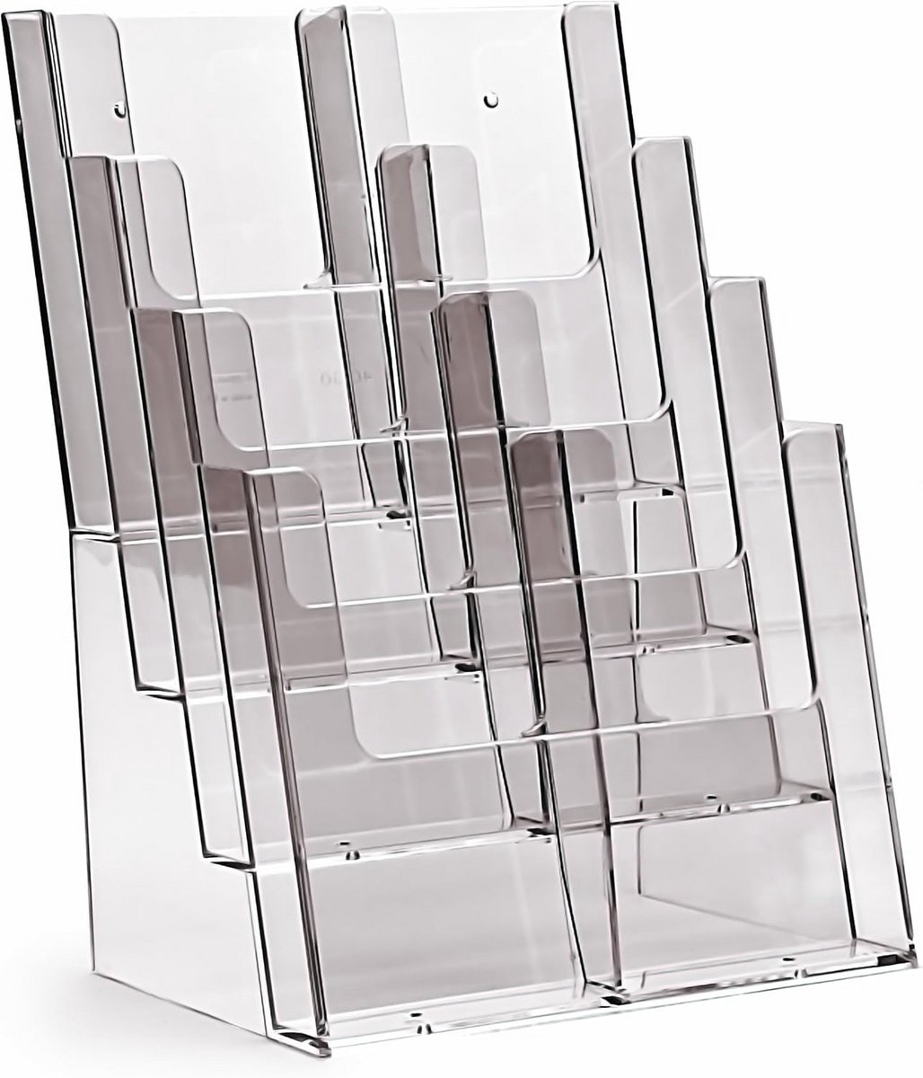 Professionele, transparante brochurestandaard met 4 verticale vakken voor het presenteren van uw A4-documenten, folders of flyers. Dit veelzijdige display is ideaal voor winkels, kantoren, beurzen of wachtruimtes. De standaard is voorzien van meegeleverde verdelers, waardoor u de vakken eenvoudig kunt ombouwen naar 8 kleinere compartimenten, perfect geschikt voor DIN Lang (DL) of drievoudig gevouwen brochures. Dankzij het stabiele ontwerp blijft uw presentatiemateriaal altijd netjes en overzichtelijk gepresenteerd.