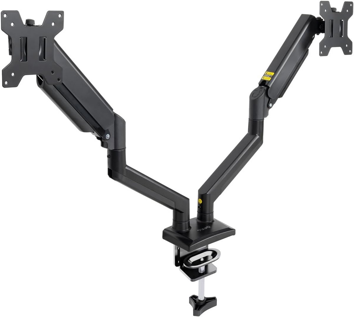 Verbeter uw werkplek met deze hoogwaardige bureauhouder voor 2 schermen van 13 tot 34 inch. De houder is geschikt voor zowel vlakke als gebogen monitoren en voldoet aan de VESA 75x75 en 100x100 standaard. De stevige constructie van hoogwaardig staal biedt een optimale draagkracht van tot 10 kg per arm. De gasdrukarmen zijn in hoogte verstelbaar tot 440 mm en uit te schuiven tot 490 mm voor de ideale beeldschermpositie. De armen bieden daarnaast een helling van +70°/-45°, draaibaar op 90°/-90° en roteerbaar op +180°/-180° voor maximale flexibiliteit en een ergonomische werkhouding. Het bijgeleverde kabelorganisatiesysteem zorgt voor een nette en overzichtelijke werkplek. De montage is eenvoudig dankzij de klem- en doorvoerschroefbevestiging, geschikt voor de meeste bureaus. De zwarte afwerking geeft uw kantoor een moderne uitstraling.