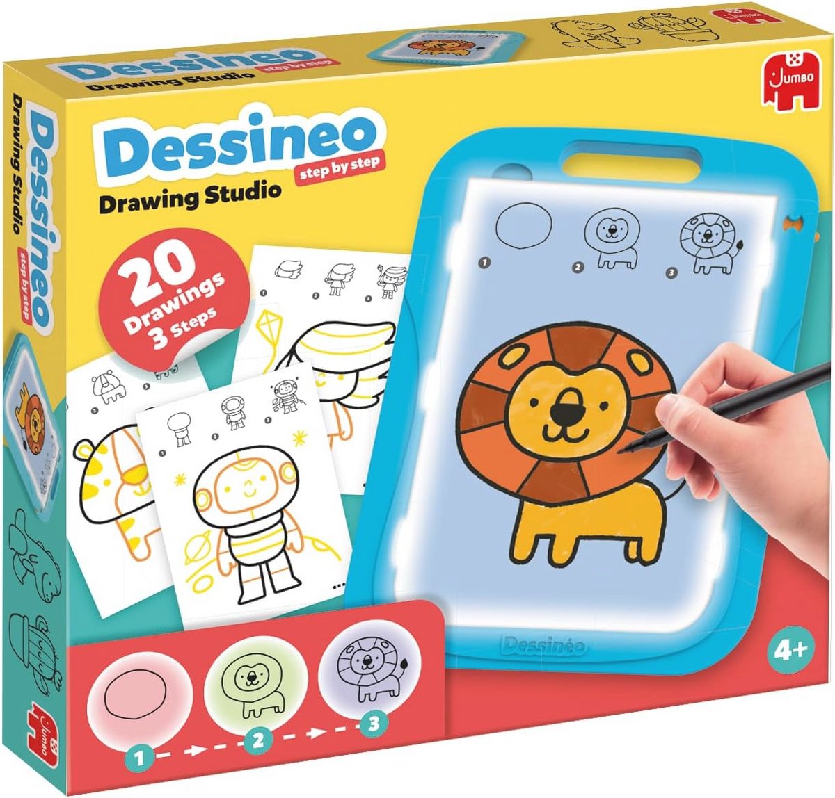 Leer stap voor stap tekenen met deze compacte tekenstudio voor kinderen! Makkelijk mee te nemen voor onderweg en op vakantie. Deze set leert kinderen 20 verschillende karakters tekenen op verschillende niveaus. Het proces is eenvoudig: kies een modelblad en leg het op de tablet. Draai de knop naar positie 1 en de eerste stap verschijnt op je lege vel. Trek over met de marker, draai naar positie 2 voor de tweede stap, en daarna naar positie 3 voor de laatste details. Je kunt je kunstwerk naar eigen smaak inkleuren. Het product bevat opbergruimte aan de achterkant voor de bladen en is voorzien van een handvat voor gemakkelijk transport. De moeilijkheidsgraad van de sjablonen wordt aangegeven met cijfers 1, 2 en 3. Let op: wegens kleine onderdelen niet geschikt voor kinderen jonger dan 36 maanden.