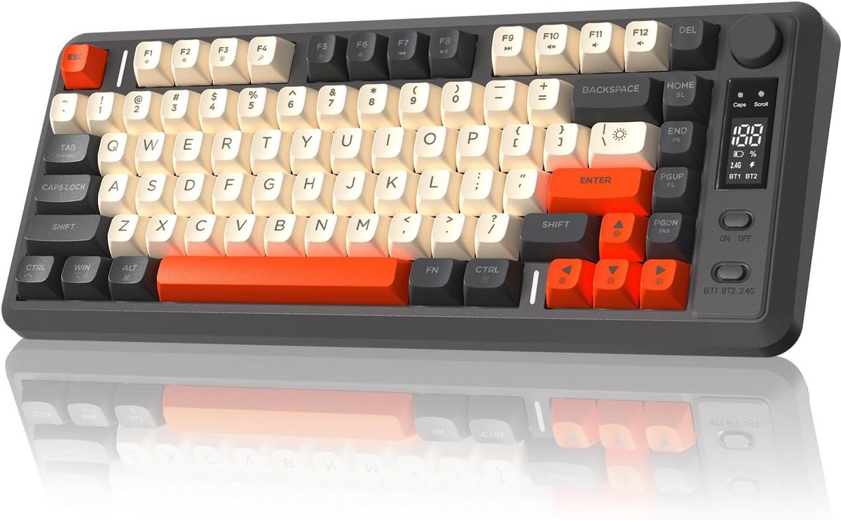 Dit veelzijdige draadloze toetsenbord biedt zowel Bluetooth- als 2.4G-connectiviteit voor ultieme flexibiliteit. Met zijn 82-toetsen opstelling en compacte PBT-gradient toetsen biedt het een comfortabele typervaring. Het toetsenbord is voorzien van een controleknop en een display scherm voor gemakkelijke toegang tot instellingen. De regenboogverlichting zorgt voor een opvallende uitstraling, terwijl de krachtige 2000mAh batterij langdurige prestaties levert. Volledig niet-conflict voor een optimale gaming- en werkomgeving op zowel Mac als Windows.