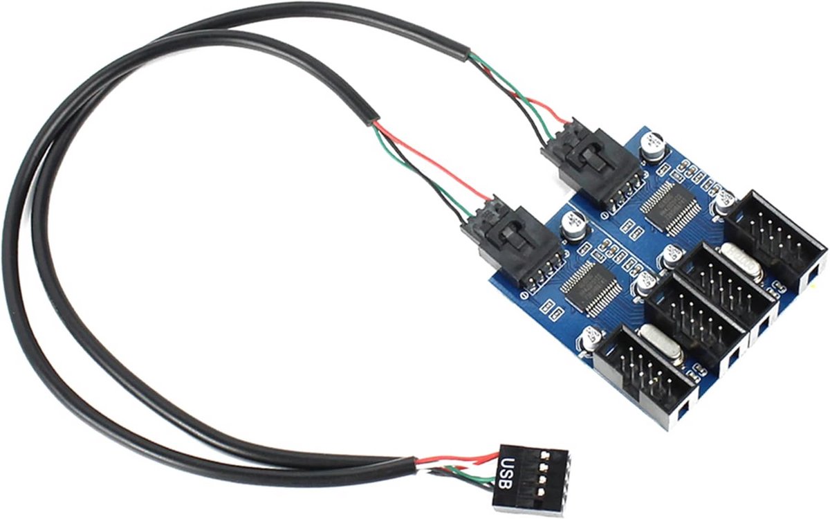 Uitbreidingskaart om één interne 9-pins USB 2.0 header op uw moederbord te splitsen naar vier vrouwelijke 9-pins poorten. Ideaal voor het aansluiten van extra interne USB-apparaten zoals ventilatoren, LED-strips, WiFi-ontvangers of andere USB-hubs. De splitter beschikt over dubbele chipset voor stabiele verbindingen en wordt geleverd inclusief een 9-pins USB 2.0 mannelijke naar 9-pins vrouwelijke verlengkabel van 30 cm. Het bord is voorzien van een ruglijm (3M sticker) voor eenvoudige en stevige montage op het moederbord of een andere geschikte locatie. Let op: voor optimale werking wordt aangeraden de apparaten één voor één aan te sluiten nadat het systeem is opgestart.