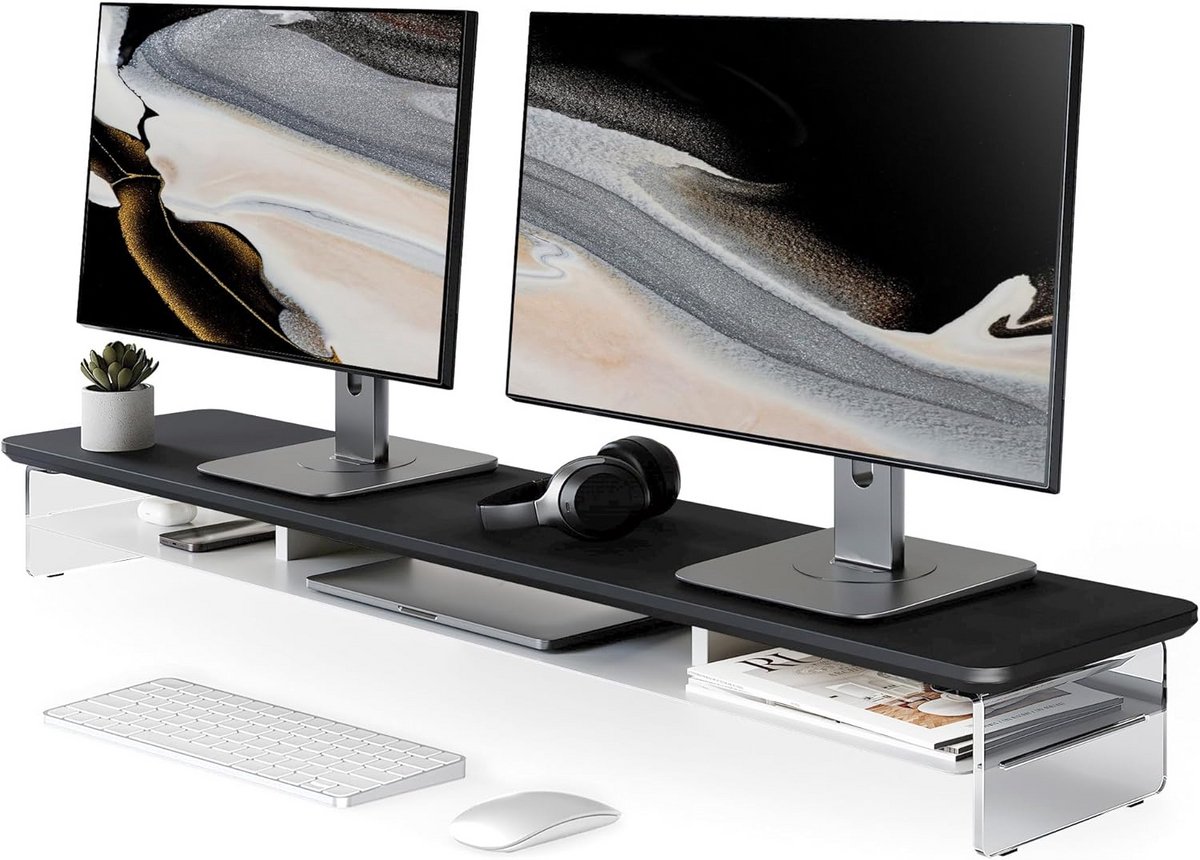 Creëer een ergonomische en opgeruimde werkplek met deze luxe, verhoogde monitorstandaard van dik acryl. Dit dubbele monitorverhogerplatform biedt niet alleen een ideale kijkhoek voor uw PC-monitor, laptop of TV, maar optimaliseert ook de ruimte onder het blad. **Kenmerken & Voordelen:** * **Hoge Kwaliteit Materialen:** Gemaakt met een stevig 18 mm acryl tafelblad en elegante 8 mm acryl poten. Voorzien van rubberen pads voor extra stabiliteit en om krassen op uw bureau te voorkomen. * **Robuuste Constructie:** Ontworpen om zwaar te belasten, met een draagvermogen tot wel 45 kg. Perfect voor het veilig plaatsen van meerdere monitoren, printers of kleine televisies. * **Veelzijdige Opbergruimte:** De ruimte onder de verhoger is ideaal voor het opbergen van uw toetsenbord, muis, notitieblokken of andere kantoorartikelen, wat zorgt voor een opgeruimd bureau. * **Modern en Elegant Design:** Het heldere acrylontwerp past moeiteloos in elk interieur. Beschikbaar in diverse kleurencombinaties om bij uw stijl te passen. * **Eenvoudige Montage:** Snel en gemakkelijk op te zetten, zodat u direct kunt genieten van een betere werkplek. Afmetingen: 108 x 23.5 x 12 cm.