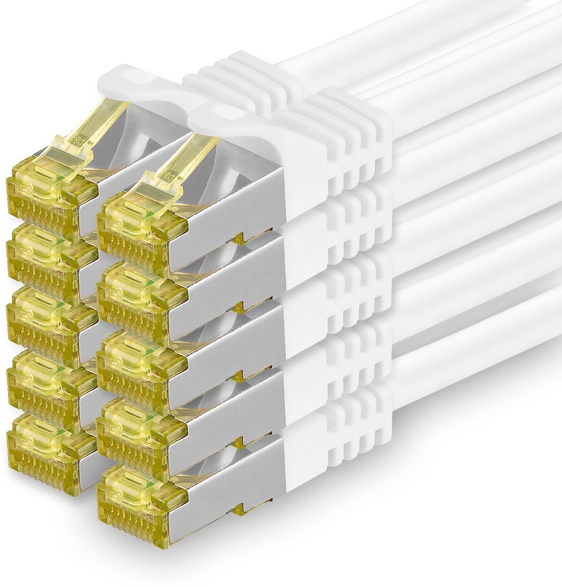 Set van 10 hoogwaardige CAT.7 netwerkkabels van elk 2 meter lang, uitgevoerd in wit. Deze LAN/Ethernet kabels zijn dubbel afgeschermd (S/FTP met PIMF) en getest tot 600 MHz, waardoor ze geschikt zijn voor netwerken tot 10.000 Mbit (10 Gigabit). Voorzien van RJ45-stekkers met 3µ vergulde contactvlakken voor een betrouwbare verbinding. De kabels hebben een stevige maar flexibele ronde mantel (LSZH-conform) en slimline knikbescherming aan beide zijden. Ideaal voor het aansluiten van al uw netwerkcomponenten met optimale snelheid en bescherming tegen storingen.