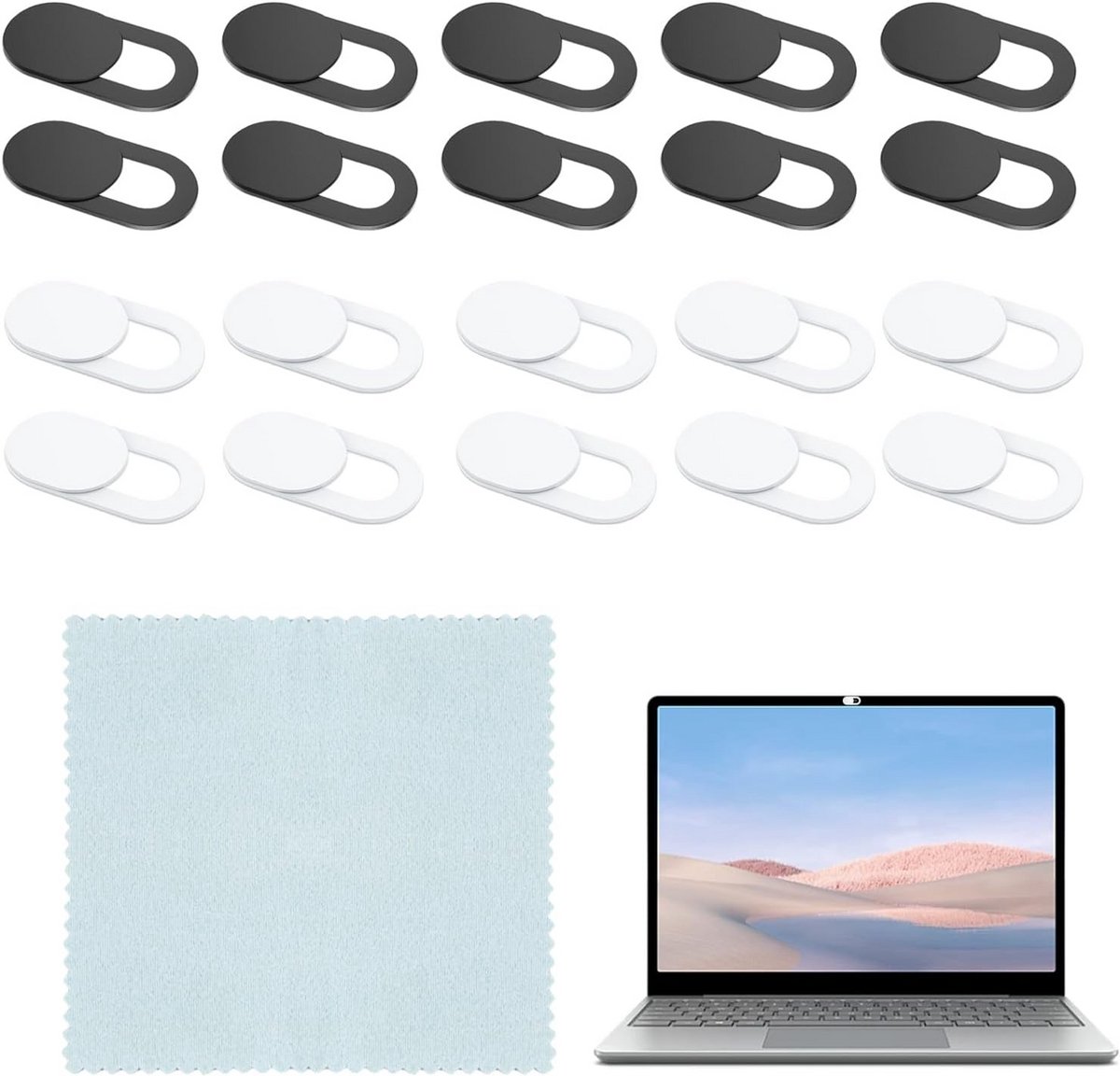 Bescherm uw privacy met deze set van 20 ultradunne webcam covers. Deze schuifregelaars zijn ontworpen voor alle laptops, smartphones, tablets en pc's en bieden effectieve bescherming tegen ongewenste inkijk. **Voordelen van deze webcam covers:** 1. **Duurzame Privacy:** Gemaakt van stevig ABS-materiaal voor optimale bescherming tegen nieuwsgierige blikken. Het extreem dunne ontwerp zorgt ervoor dat u uw laptop eenvoudig kunt sluiten, zelfs met de cover geplaatst. 2. **Eenvoudig en Praktisch:** Biedt stabiele en onmiddellijke privacybescherming, waardoor uw dagelijkse apparaatbeheer eenvoudiger en efficiënter wordt. 3. **Sterke Kleefkracht zonder Resten:** Voorzien van een zelfklevend ontwerp dat stevig hecht zonder schade aan uw apparaat te veroorzaken. Het is eenvoudig te verwijderen of te verplaatsen zonder plakkerige resten achter te laten. 4. **Snelle Installatie:** Binnen enkele seconden te bevestigen op uw webcam, waardoor u en uw gegevens altijd beschermd zijn. 5. **Veelzijdig Gebruik:** Ideaal voor thuiswerken, studie of persoonlijk gebruik, zorgt voor gemoedsrust in elke digitale omgeving. **Specificaties:** * Materiaal: ABS * Kleuren: Wit (10 stuks), Zwart (10 stuks) * Afmetingen: 18 x 9 mm (Dikte: slechts 0,55 mm) * Inbegrepen in de verpakking: 10x witte schuifregelaars, 10x zwarte schuifregelaars, 1x brillenpoetsdoekje. Wij staan achter onze kwaliteit. Neem bij vragen gerust contact op voor een snelle ondersteuning.