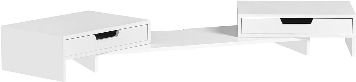 Verhoog uw schermen naar een comfortabele, ergonomische hoogte met deze uittrekbare monitorstandaard. Gemaakt van hoogwaardig MDF, kan deze standaard een gewicht tot 15 kg dragen en is hij gemakkelijk te reinigen. De lengte en hoeken zijn naar wens aan te passen (breedte verstelbaar van 60 tot 107 cm), wat ideaal is om uw werkplek netjes en georganiseerd te houden. Dankzij twee ingebouwde lades kunt u kleine kantoorbenodigdheden zoals pennen en clips opbergen. Dit creëert extra ruimte op uw bureau, aangezien u uw toetsenbord en muis eronder kunt opbergen. Voorkom rug- en nekbelasting door uw blik op ooghoogte te houden tijdens het werken.