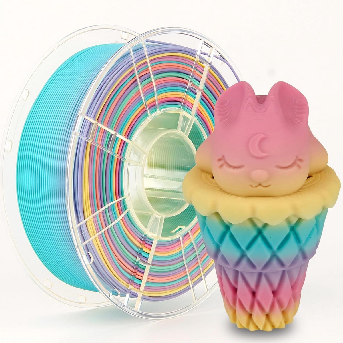 Hoogwaardig 3D printer filament met een unieke matte regenboogafwerking. Dit meerkleurige PLA filament heeft een diameter van 1.75 mm en wordt geleverd op een spoel van 1 kg. Ideaal voor het printen van opvallende objecten met vloeiende kleurverlopen. PLA (Polymelkzuur) is een gebruiksvriendelijk, duurzaam en biologisch afbreekbaar materiaal, geschikt voor de meeste standaard FDM 3D printers.
