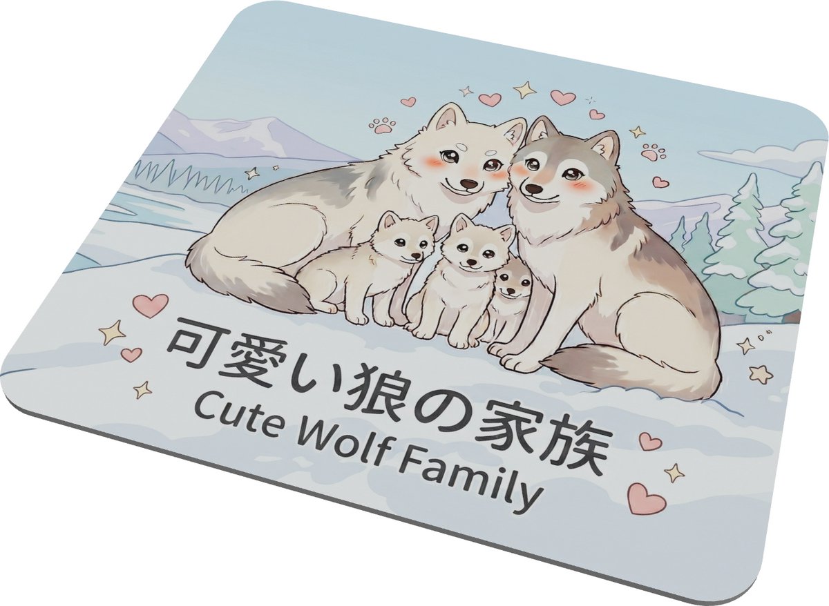 Vier de liefde met deze hartverwarmende muismat van een wolf familie die samen in de sneeuw zit. Deze mousepad uit de Kawaii Series combineert een stoer dierenthema met een extreem schattige tekenstijl en roze blosjes. Het formaat van 22 cm x 20 cm maakt het een veelzijdig accessoire voor zowel vaste pc's als compacte laptops. De achtergrond met bergen en dennenbomen in pastelblauw zorgt voor een rustgevende blikvanger tijdens drukke werkdagen. Door de hoogwaardige afwerking werkt elke muis uiterst precies op deze ondergrond, wat vermoeidheid van de hand helpt voorkomen. Het is een uniek cadeau voor haar: vriendin of collega, vooral voor liefhebbers van honden en wolven. De vrolijke hartjes boven de wolven maken het ontwerp helemaal af voor een warme sfeer.