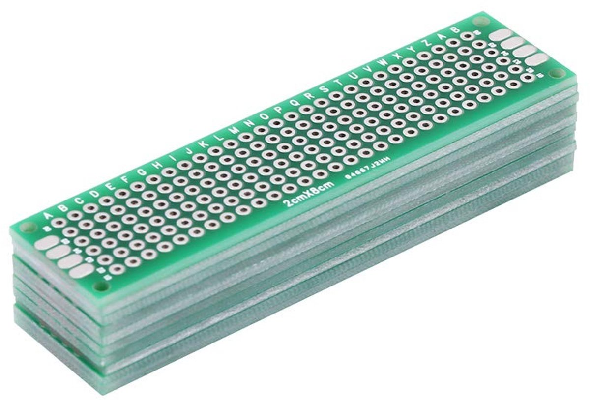Ontdek de veelzijdigheid van onze hoogwaardige universele printplaten, ontworpen voor de veeleisende doe-het-zelver en elektronicaprojecten. Deze dubbelzijdige, vertinde printplaten zijn ideaal voor het bouwen van elektronische prototypes en bieden een betrouwbare basis voor uw creatieve projecten. Met een handige maat van 2 x 8 cm en duidelijke referentieletters aan beide zijden, zijn deze printplaten perfect voor zowel beginners als ervaren hobbyisten.